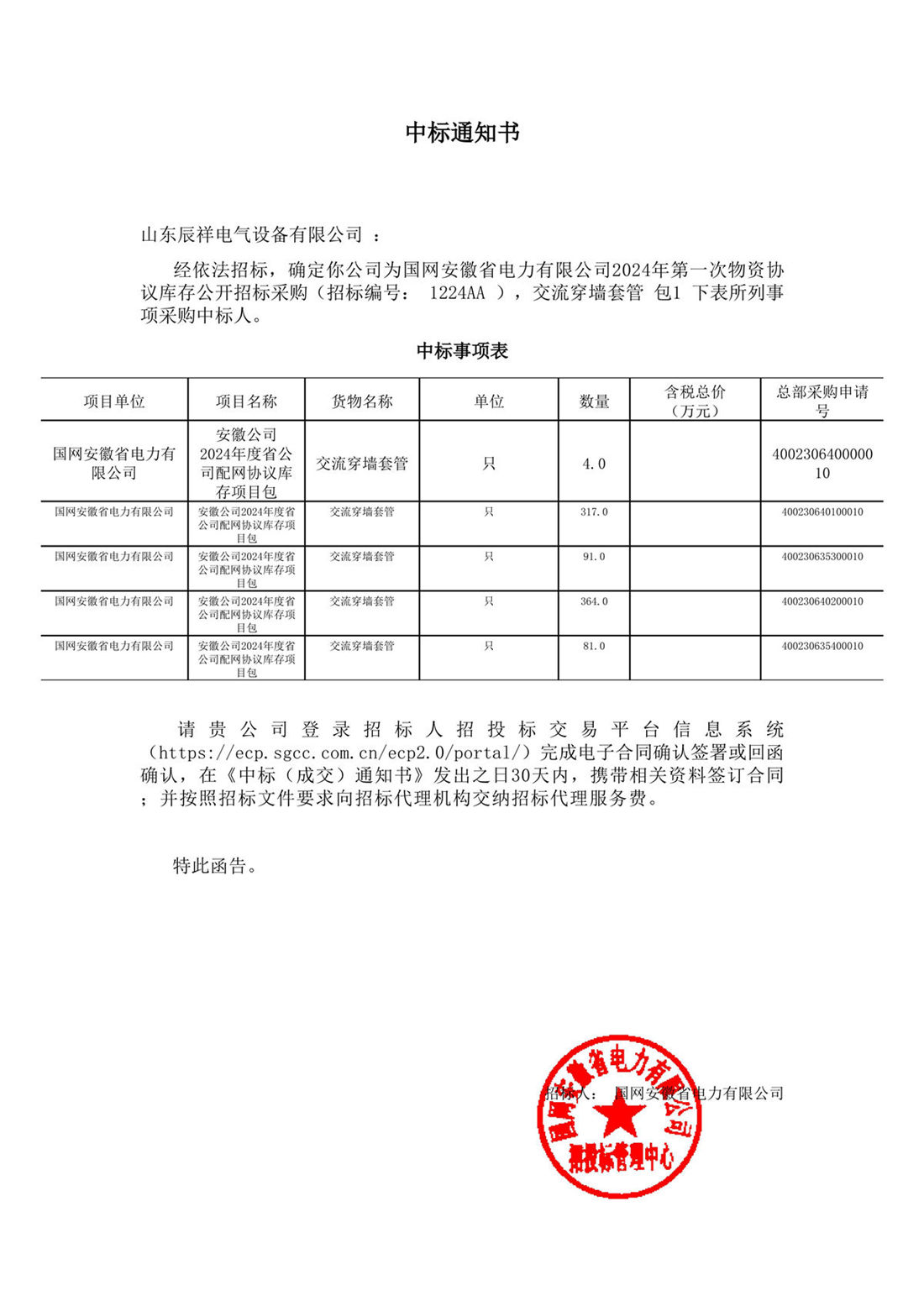 常州東智2024年試驗站用穿墻套管采購項目成交通知書
